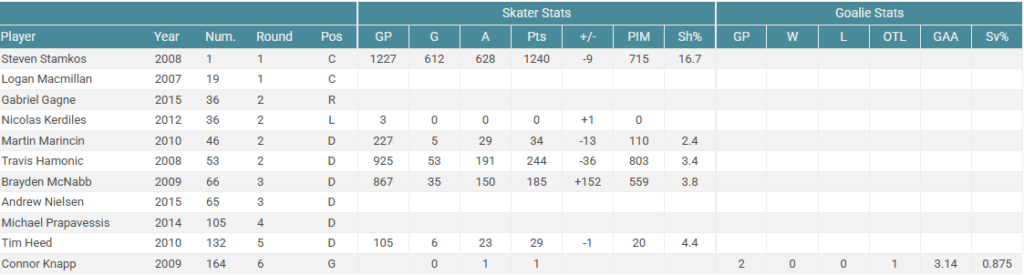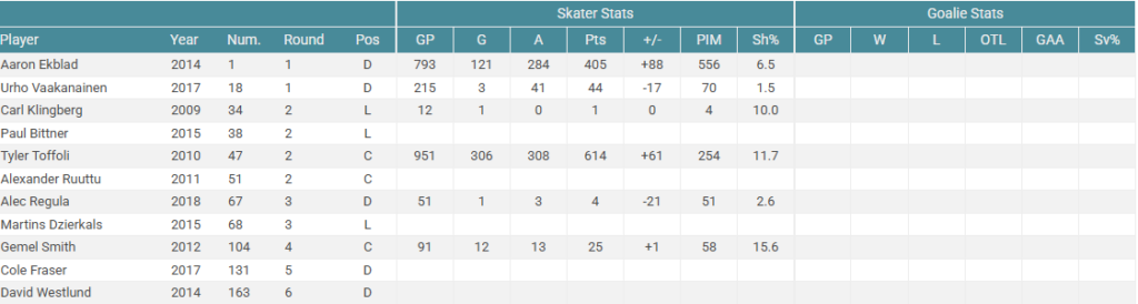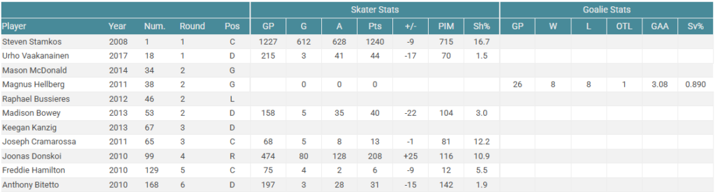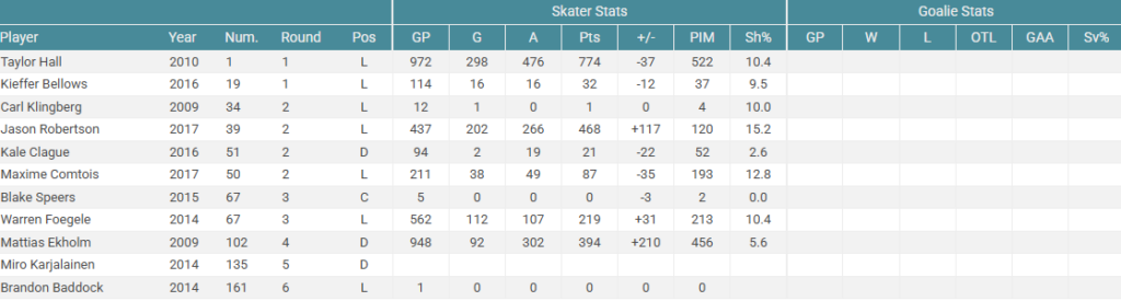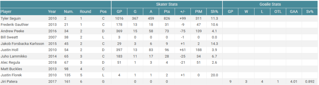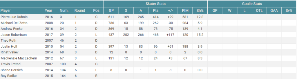 If this was your draft result, you would probably be quite disappointed. Tyler Seguin has been a very good player for most of his career, but falls short of being a franchise player. Is he a #1 center on a Stanley Cup contending team? Arguably he can and has been so while you’d be sastisfied drafting Seguin #1-3 overall, he isn’t the franchise player you’d hope for. The rest of this draft is pretty meh too. Mostly bottom of the roster and depth players. Overall this wouldn’t dramatically change the future of the Calgary Flames.