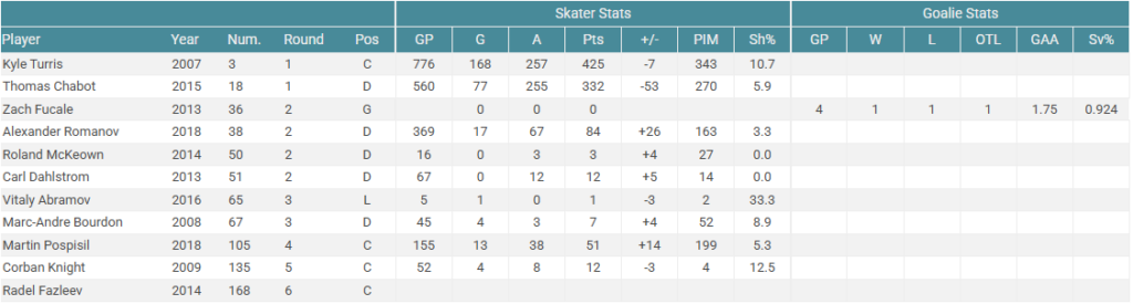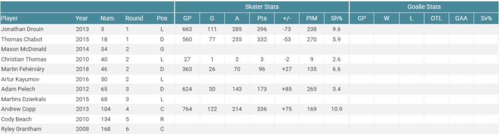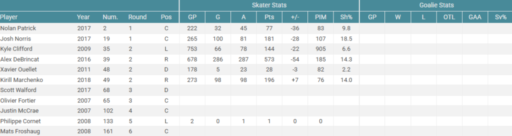 There is some good players here but nothing to overcome the massive bust with the top pick. Norris, Clifford, DeBrincat and Marchenko are all solid forwards, but if you had these four guys in the prime of their careers on your roster you’d still need to add a lot of superior talent around them to make them a Cup contender.