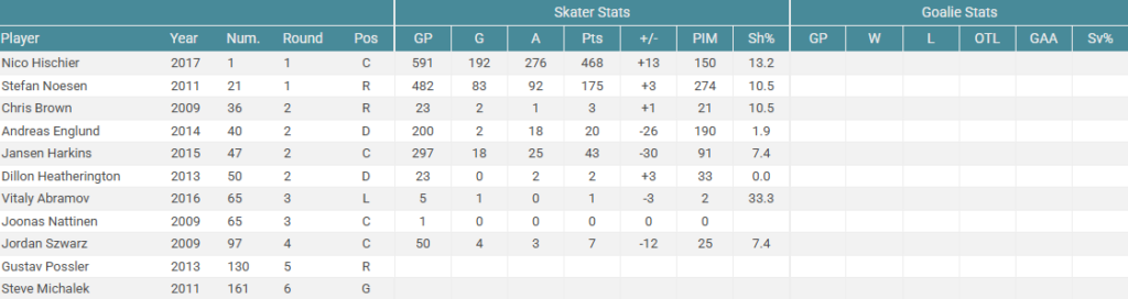 Once again, you are happy drafting Hischier, but he isn’t the franchise player you hope for in a top 3 pick. After that there isn’t much to get excited about. Noesen and Harkins are useful bottom 6 players but nothing to get too excited about. Hischier makes this not a total disaster but this isn’t what I think most Calgary fans would hope for.